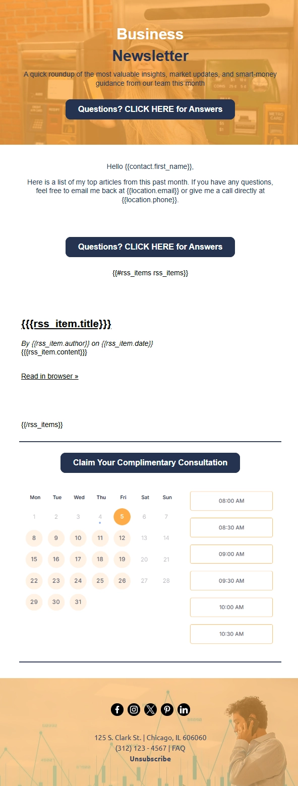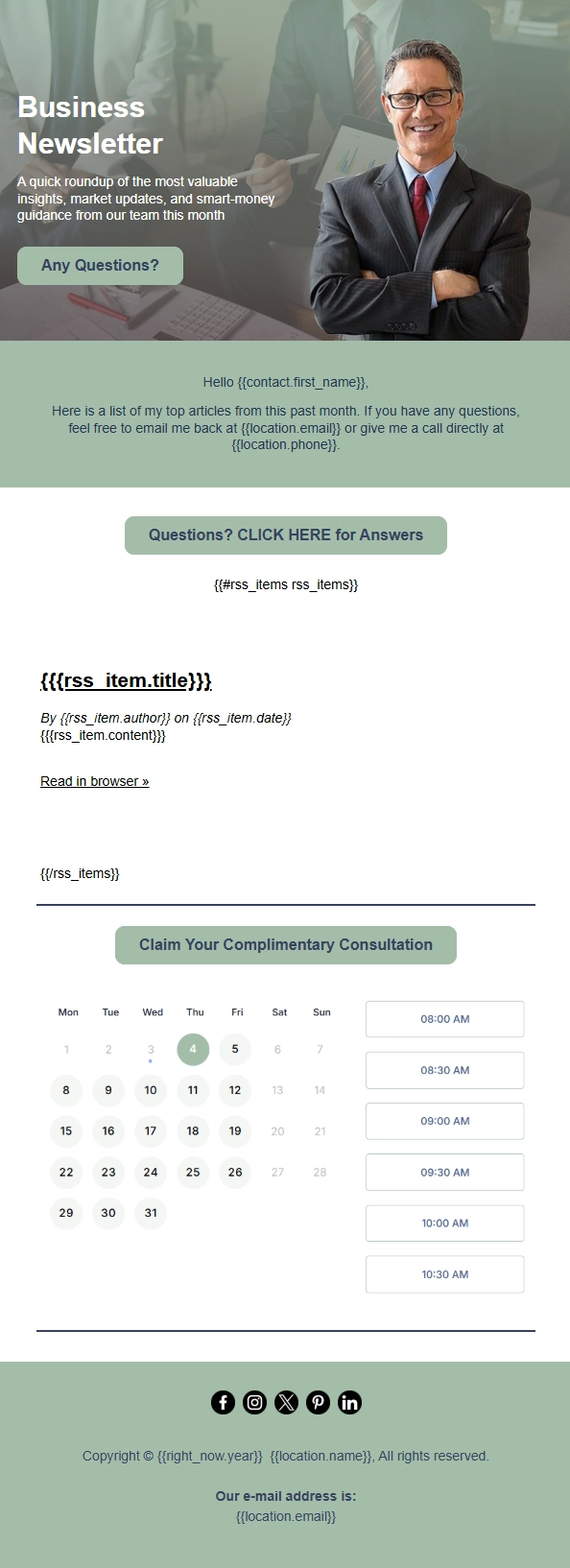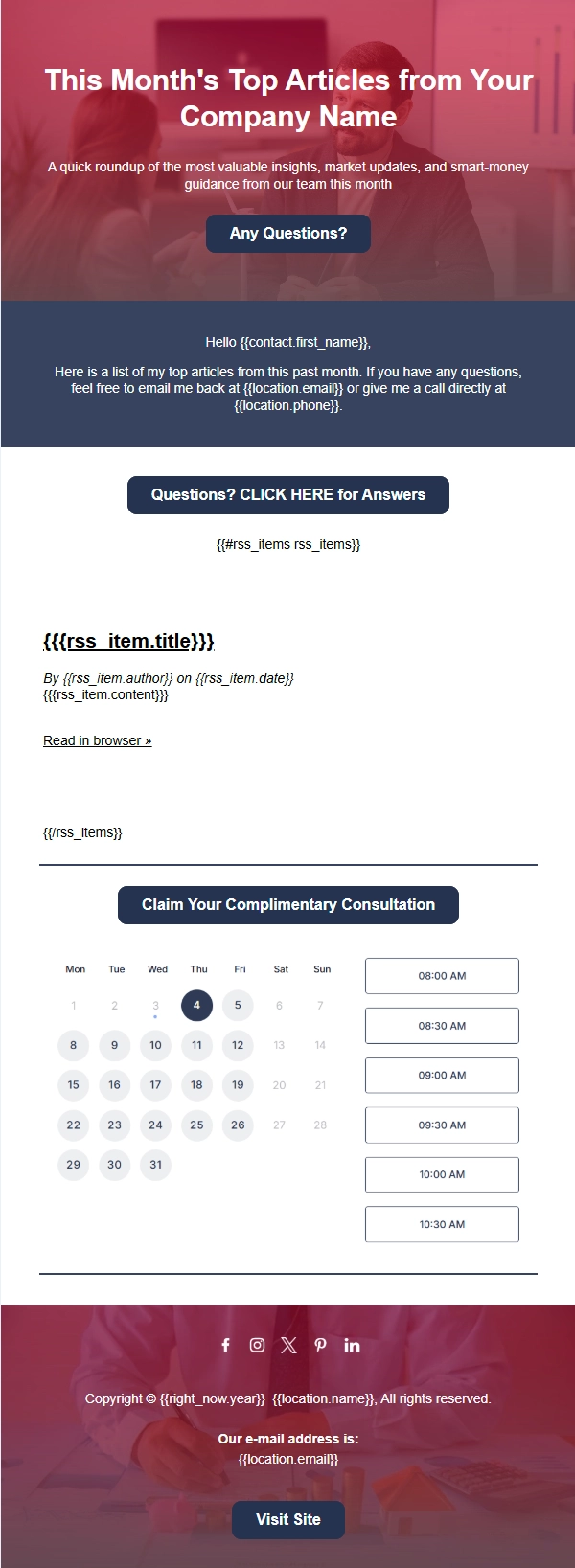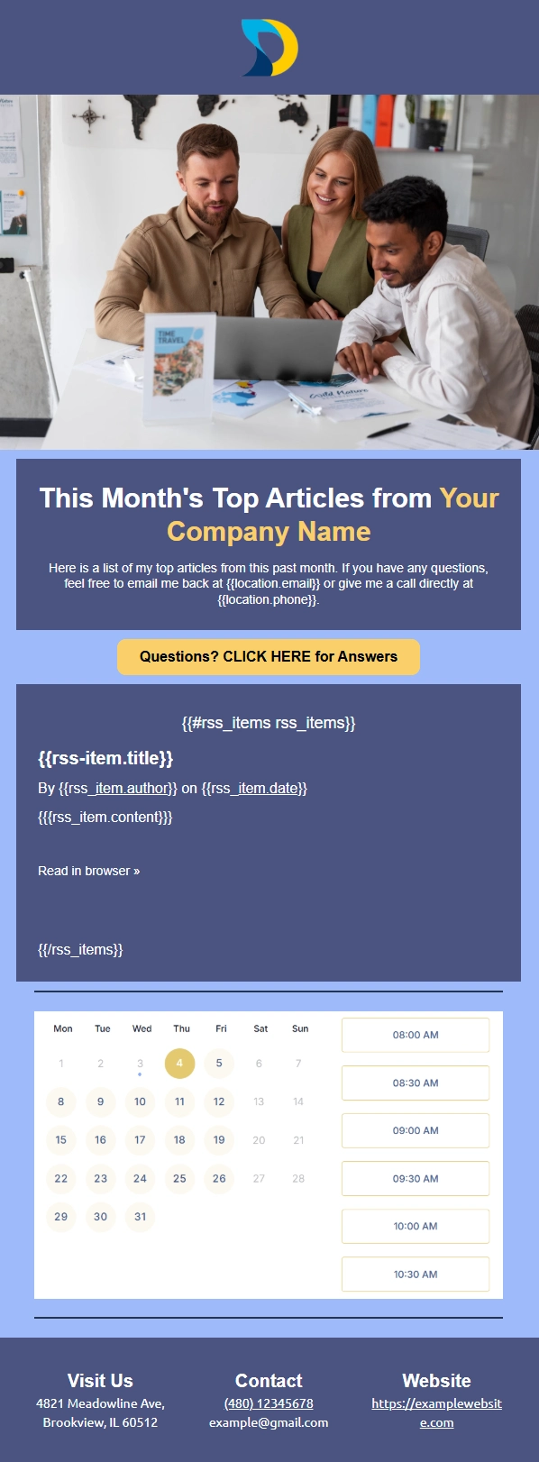 Your newsletter updates itself using your RSS feed so you never need extra writing. Stay consistent while saving time every month.